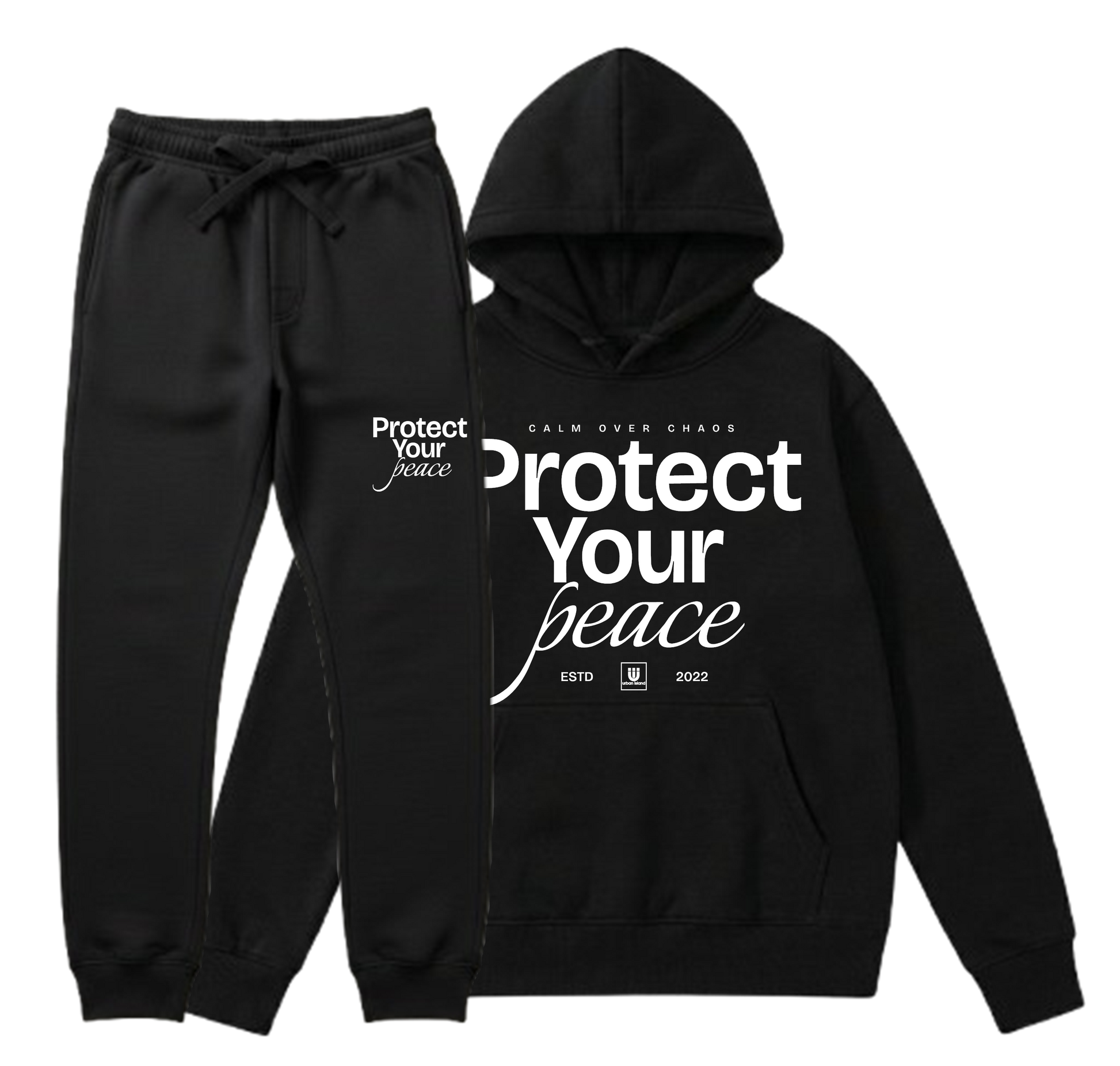 Crafted from premium middleweight fleece, this matching hoodie and jogger pant set offers a relaxed, unisex fit that delivers all-day comfort without sacrificing style. The bold Protect Your Peace typography across the chest makes a clean statement, while the minimalist logo on the left leg keeps the look balanced and refined.